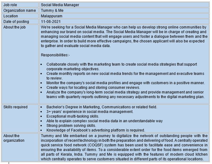| About the organization | Tummy & Me formed to serve Mankind in goodness activities in 2019. Later the management behind Tummy &Me has been in the food industry for the past years. From 2020 onwards, Tummy & Me enlarges its operations all over Kerala and in the metro cities of South India by cloud kitchen and delivery services. A group of Kerala-based food entrepreneurs formed Tummy & Me. We promote a healthy and delicious Community in our society. Tummy & Me is a word invented by Foodies who have a deep emotional connection to their food |