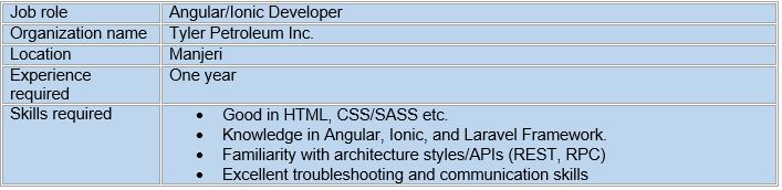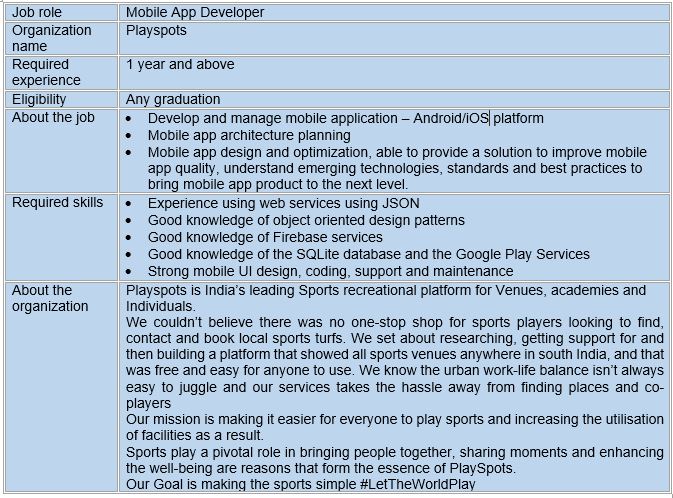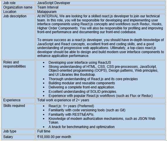 | Key Skills required | React.js, HTML, CSS, Bootstrap • Strong analytical, problem solving, and troubleshooting skills • Experience with React.js and with libraries that are part of the React Ecosystem (Redux, Context Hooks) • Experience in developing JavaScript(ES6+) based Single Page applications • Experience in developing component abstractions, and should have authored reusable components • Proficiency in working with HTML5, CSS3, Bootstrap • Proficiency in working with Node.js • Proficiency in with building RESTful APIs • Proficiency in with building Progressive Web APP(PWA) Additional Note Experience in CSS pre-processors, such as LESS or SASS and JavaScript frameworks such as Angular JS / view JS is considered as an additional qualification. Ability to think Out of Box to create innovative solutions. |