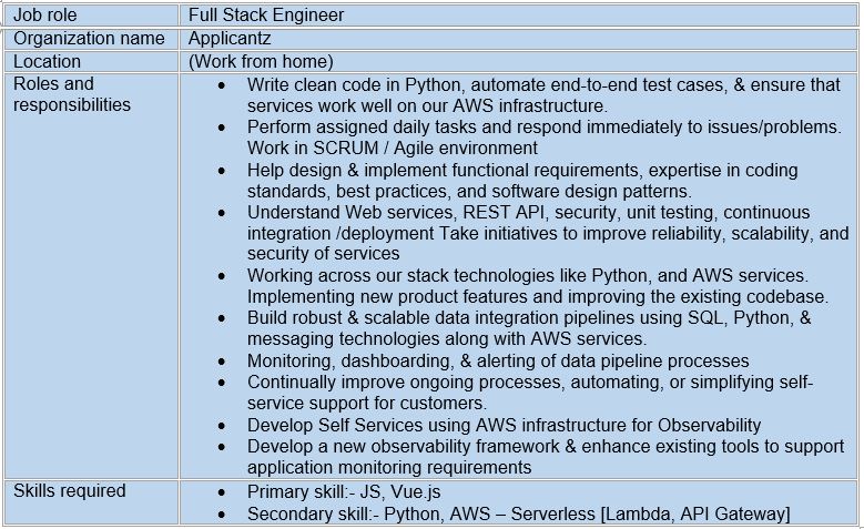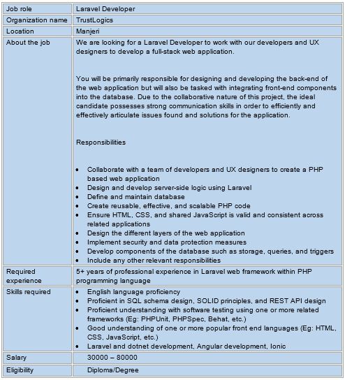 | Experience required | · Expertise in Angular or ReactJs · Experience in NodeJS / PHP with any framework · Good to have understanding of state-management patterns such as Redux, Flux or similar · Experience working with SQL or NoSQL databases · Experience with Git version control |