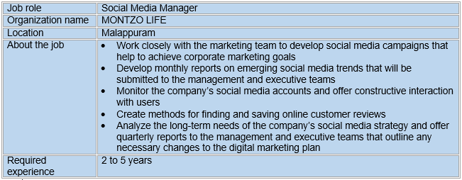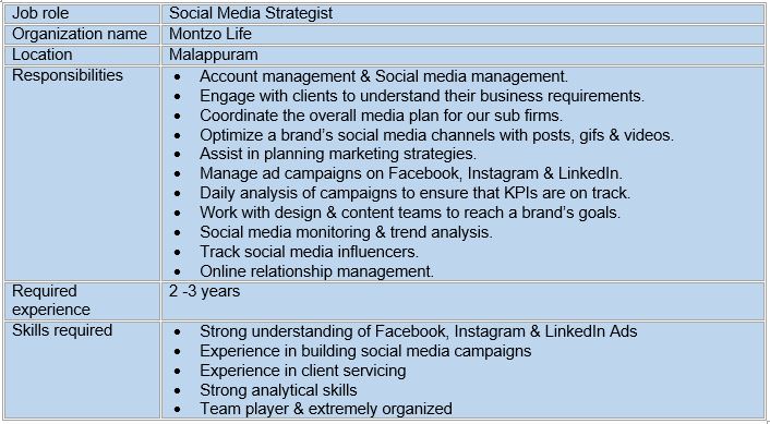 | Desired skills | · Proven work experience as a Social media strategist or Social media manager · Hands – on experience using social media for brand awareness · Understanding of organic and paidweb traffic metrics · An ability to identify target audience preferences and build content to meet them · Excellent multitasking skills · Excellent writer with the ability to communicate concise , action – oriented copy that builds engagement and trust among target audiences |