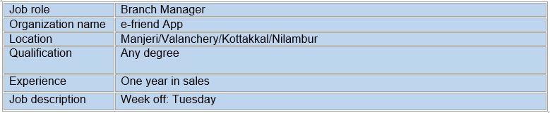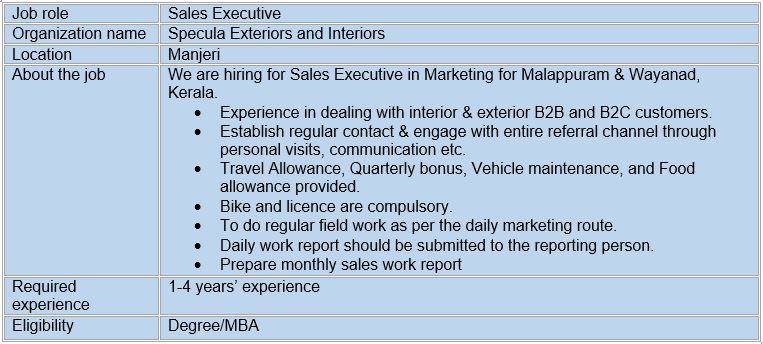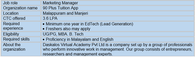 | Job description | Looking for candidates with work experience of at least 10+ years of experience in business development marketing and sales in Edu-Tech, Telecom companies or FMCG, etc The ideal candidate will prospect and close sales lead to help generate revenue for the company. They will also be responsible for developing, implementing, and evaluating the sales strategy. They will have strong management and coaching skills to support the learning and development of the sales team. currently, we are looking for Thrissur, Kochi, Malappuram region people only Responsibilities · Support the learning and development of the sales team · Coordinate with the sales representatives to generate and meet with prospective leads · Track and report all sales activities · Develop and execute sales strategy through market analysis Qualifications · Experience in managing sales teams · Experience generates and maintaining relationships with sales leads · Excellent written and verbal communication skills CTC: 13 LPA |