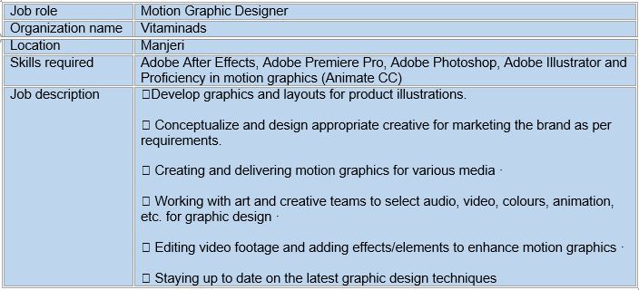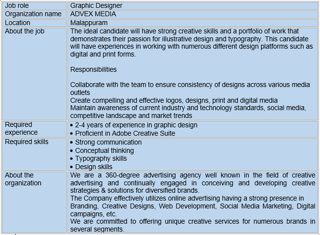| About the job | Should be experienced in Photoshop, illustrator, in design, pacemaker/ Corel draw extra. Good communication skills and able to handle students batches |