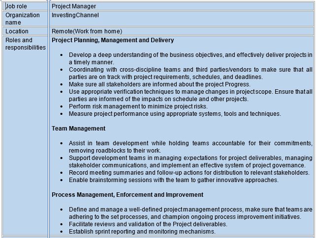 | Responsibilities | · Set project timeline · Monitor project deliverables · Update relevant stakeholders or team members on the project progress · Coach and support project team members with tasks you assign them |